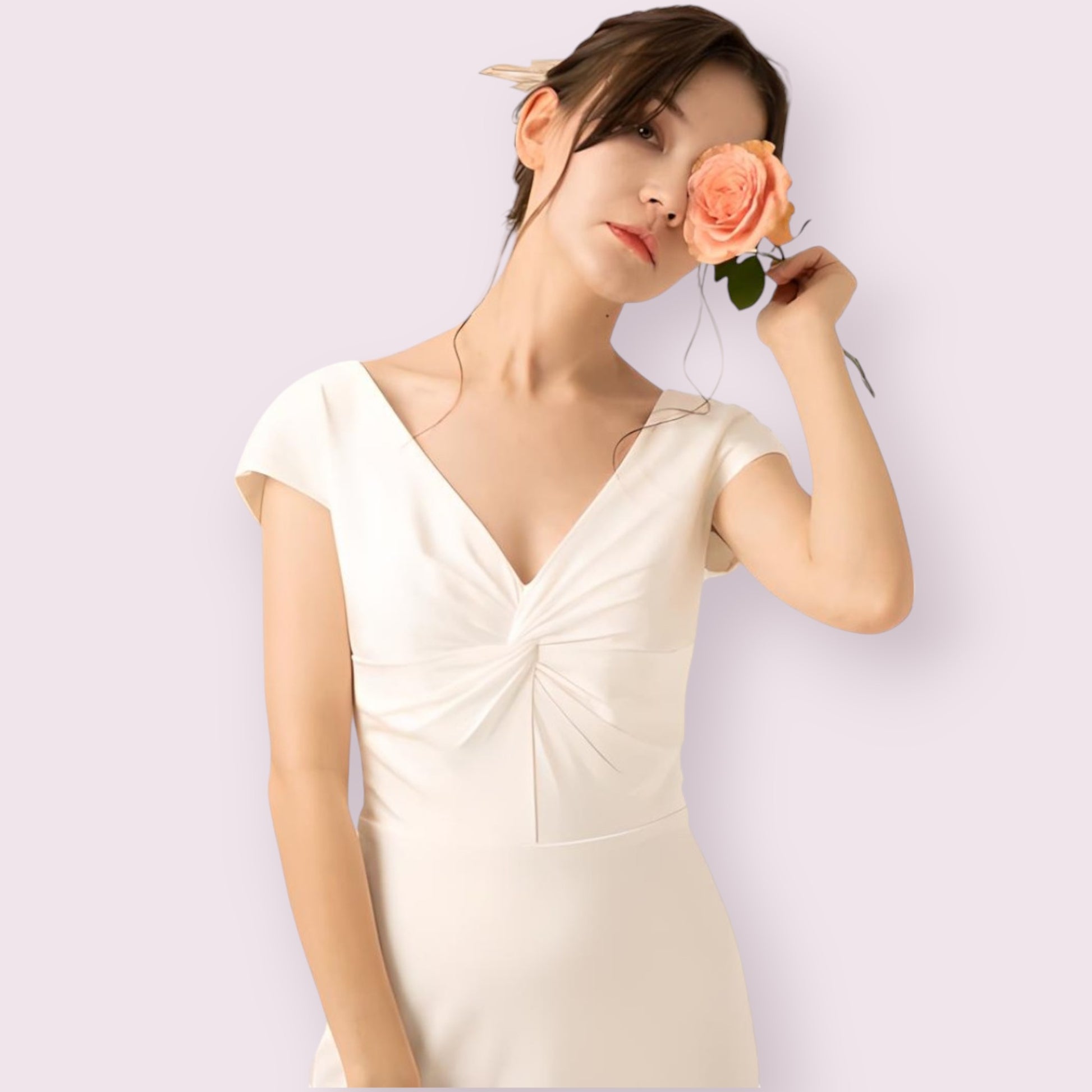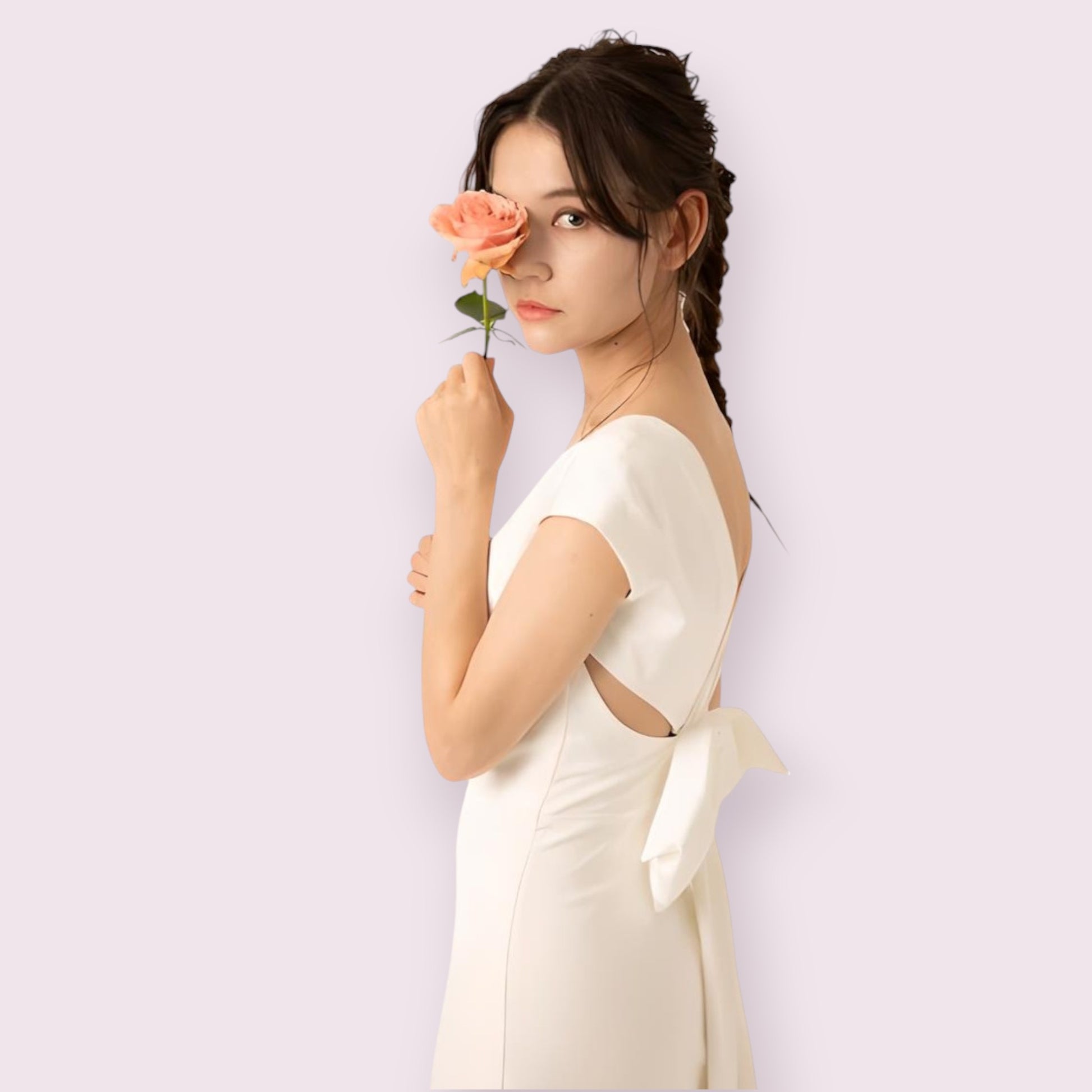 Ethereal elegance meets modern charm in this enchanting wedding gown. Featuring a deep V-neckline and delicate cap sleeves, this sheath silhouette gracefully enhances the bride’s figure. The back of the dress is adorned with an oversized bow detail, cascading into a soft drape that adds a whimsical touch. Crafted from smooth, lightweight fabric, this gown is perfect for a minimalist yet romantic bridal look. The understated train completes the ensemble, making it a timeless choice for both intimate and grand celebrations.